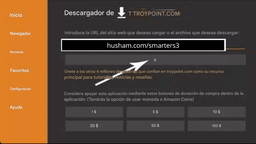 16. Escribe la siguiente URL exactamente como se muestra aquí: https://www.iptvsmarters.com/smarters.apk